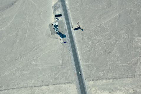 En traversant le plateau aride qui précedent Nazca, nous nous arretons sur la panaméricaine ; Un mirador permet d’observer 3 figures proches : Les mains, l’arbre et le lézard dont la queue est coupé par la route.