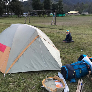 Après 6,7 km de marche Eloi et Papa installent leur tente et allument un feu pour déguster un bon repas trappeur : apéro, pommes de terre / fromage et bananes au chocolat , sans oublier les chamallow grillés. Après quelques parties de cartes, il est temps de se glisser au chaud dans les duvets pour une nuit bien fraiche !